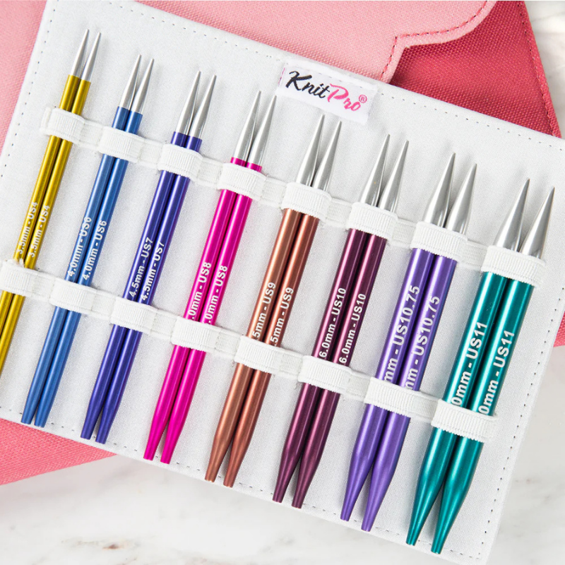 8 boyutta Zing değiştirilebilir misinalı şiş seti (3.50, 4.00, 4.50, 5.00, 5.50, 6.00, 7.00 ve 8.00), 4 kablo uzunluğunda (60cm, 2 adet 80cm ve 100cm) ) çekici bir açık pembe kumaş çanta içinde paketlenmiştir.
